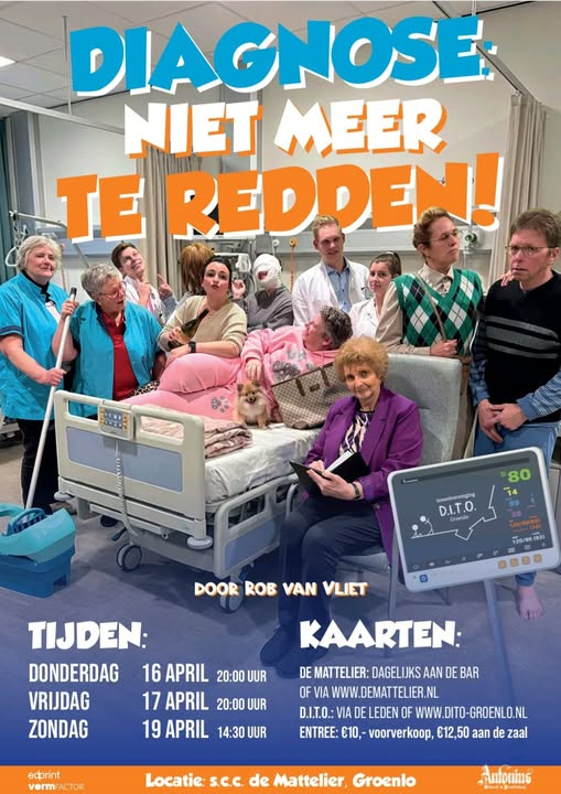 DITO Groenlo nodigt je van harte uit voor een avond vol humor, chaos en herkenbare situaties in het ziekenhuis. In “Diagnose: niet meer te redden!” maken we kennis met een bont gezelschap van patiënten en personeel, elk met hun eigen eigenaardigheden.